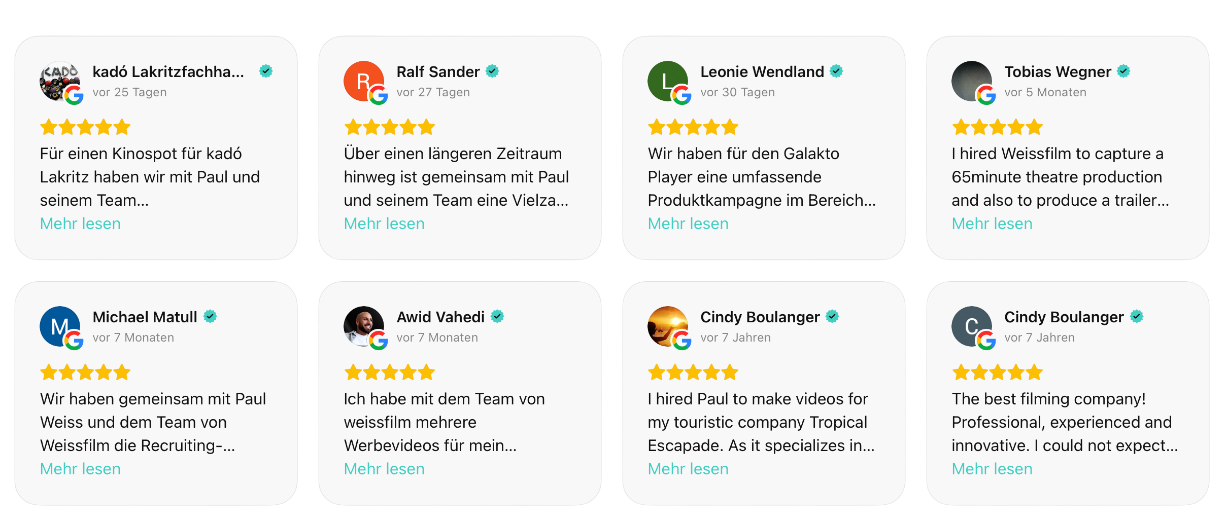 Drei Dinge: 1) Wir denken Performance first – jeder Spot wird für Conversions optimiert, nicht nur für Ästhetik. 2) Wir sind extrem effizient – kein aufgeblähtes Team, keine endlosen Meetings. 3) Wir liefern Kino-Qualität zu einem Preis, den sich auch Startups und KMUs leisten können.